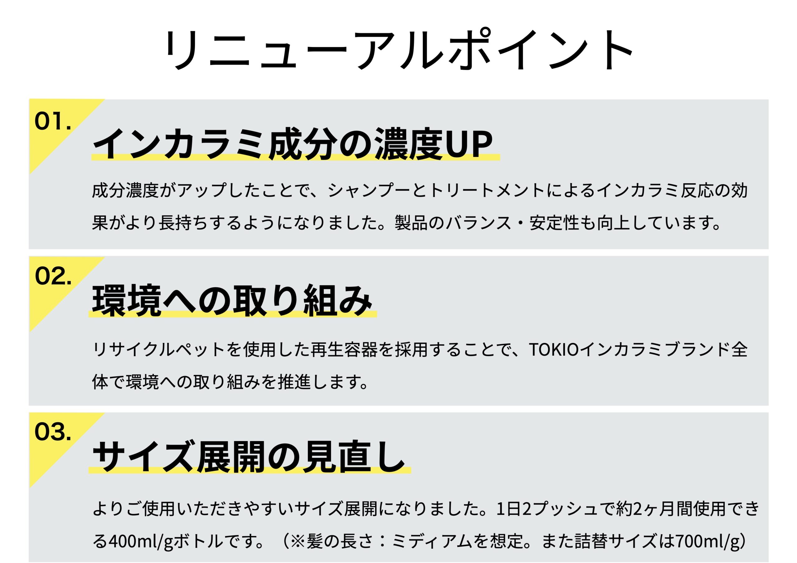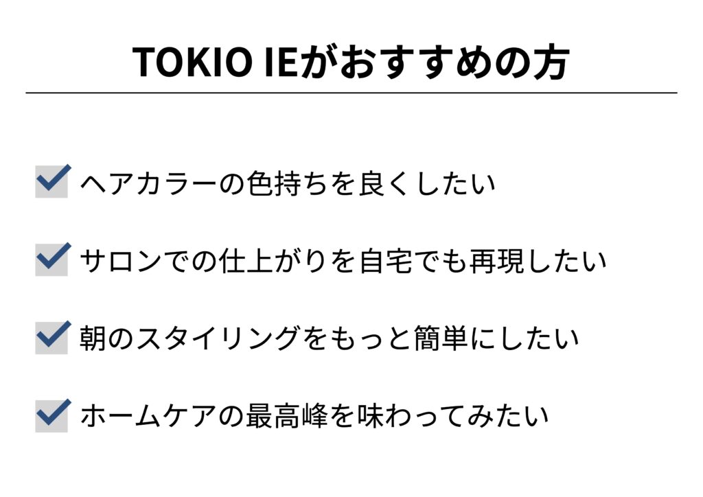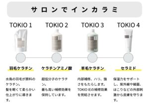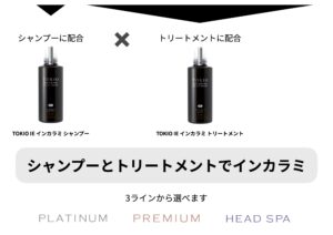 サロンで使用しているTOKIOトリートメントの成分を、そのままシャンプー・トリートメントに配合することによって、TOKIOの最大の特徴である『特許技術インカラミ』という反応を、シャンプーとトリートメントでも得られるというホームケアシリーズです。
